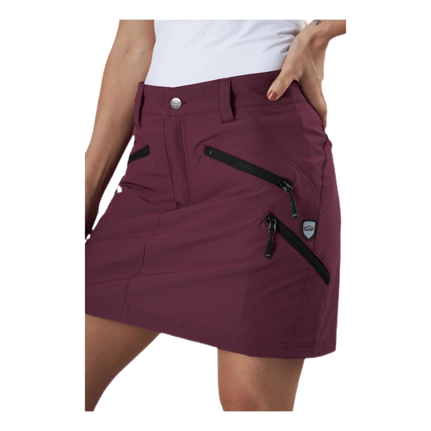 Flexi skort on monikäyttöinen skort (hame alushousuilla) – suuri suosikki Tuxerin valikoimassa. Tämä tekninen hame on suunniteltu keskipitkäksi, jotta voit saavuttaa maksimaalisen liikkuvuuden toiminnan aikana. Hiertymisen estämiseksi hameessa on pehmeää polyesteriä oleva sisähousu, joka pysähtyy noin 5 cm ennen hameen reunaa. Materiaali on kiinteää ja joustavaa ja erittäin joustava. Shortseissa on useita älykkäitä yksityiskohtia, jotka tekevät vaatteesta hyvän vaihtoehdon shortseille; kaksi vetoketjullista taskua edessä vyötäröllä ja yksi reidessä. Hameen takana on leikkaus, jotta voit astua ulos kunnolla, kun olet aktiivinen tai ulkona kävelyllä. Hame sopii täydellisesti myös golfhameeksi, melahameeksi ja tennishameeksi