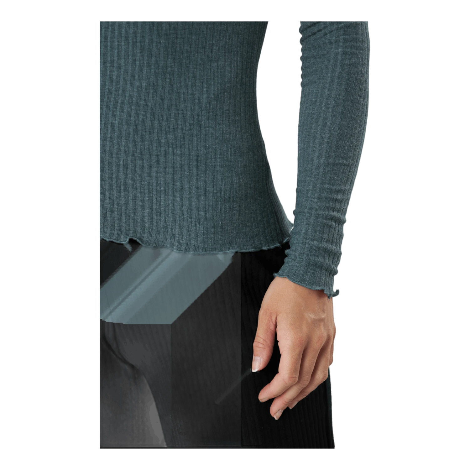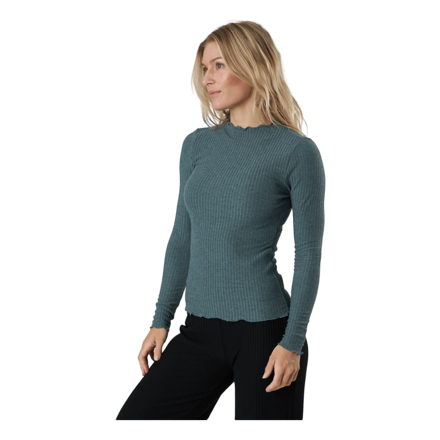 Pitkähihainen toppi, joka on valmistettu polyesterin, viskoosin ja elastaanin sekoituksesta optimaalisen mukavuuden ja hengittävyyden takaamiseksi. Korkea pääntie tarjoaa imartelevan vaihtoehdon perinteiselle v-pääntielle.