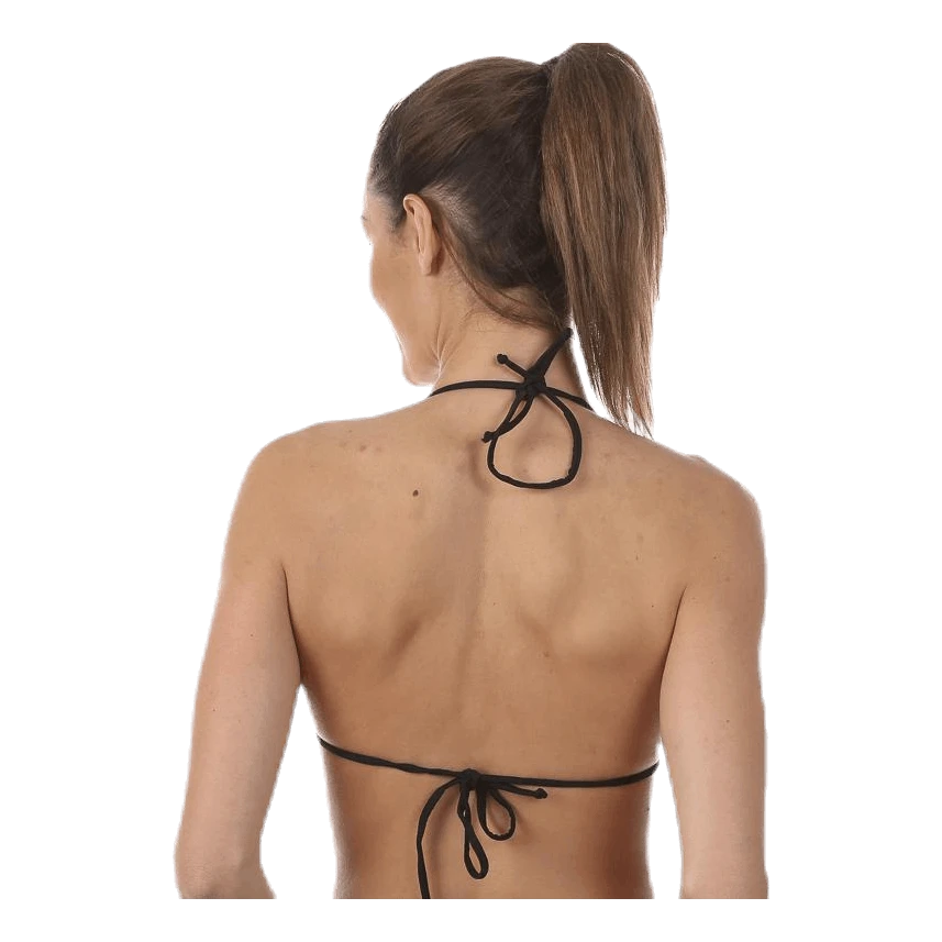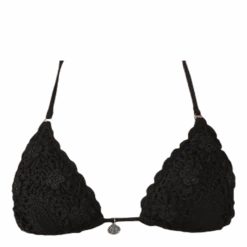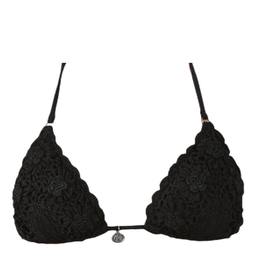 Virkattu triangel toppi irroitettavalla pehmusteella sekä koristeellisella metallisella logolla. Solmitaan niskan ja selän takaa. Materiaali: 65% Viskoosia 35% Polyamidia, vuori 80% Polyamidia 20% Elastaania, käsinpesu. Hopeanväriset metalliyksityiskohdat eivät sisällä nikkeliä ja ne ovat EU-standardin mukaiset.